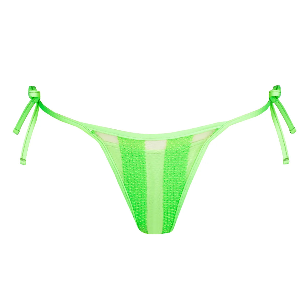 • Coupe échancrée, couverture minimale et cordons réglables pour un look de plage osé.
