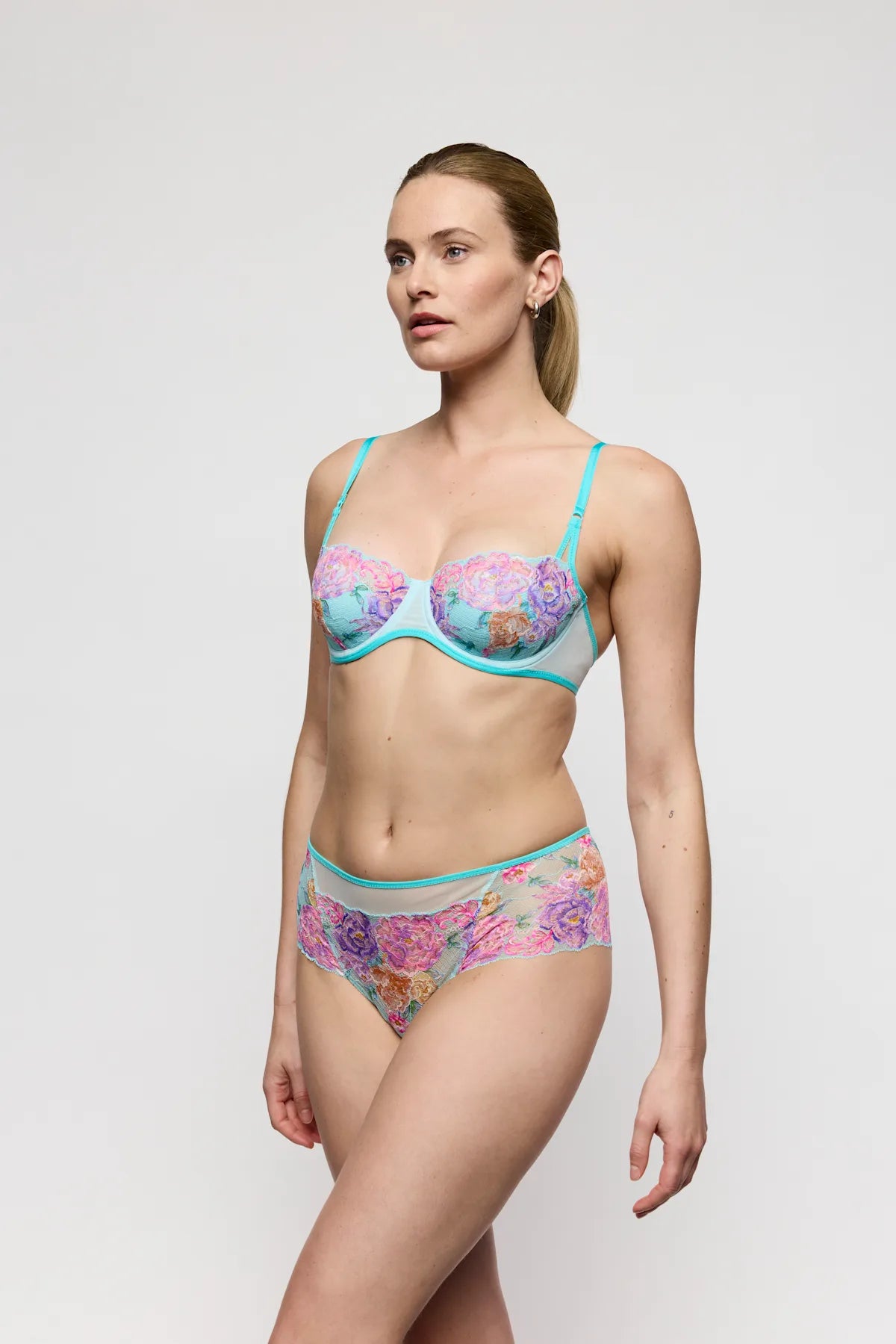 Marie Jo Lisbeth est à la mode et s'ajuste parfaitement. La dentelle imprimée de fleurs surprenantes avec une bordure noire sur un tissu gris fait de cette série un incontournable unique.